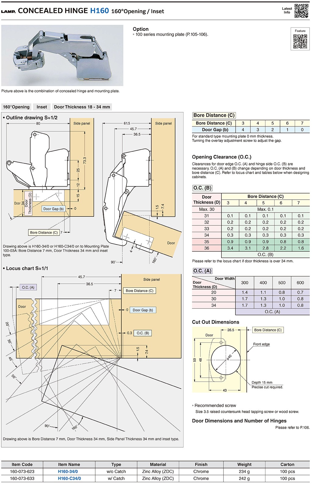 H160-34/0 Петля внутренняя для толстых фасадов без пружины, угол открывания 160º