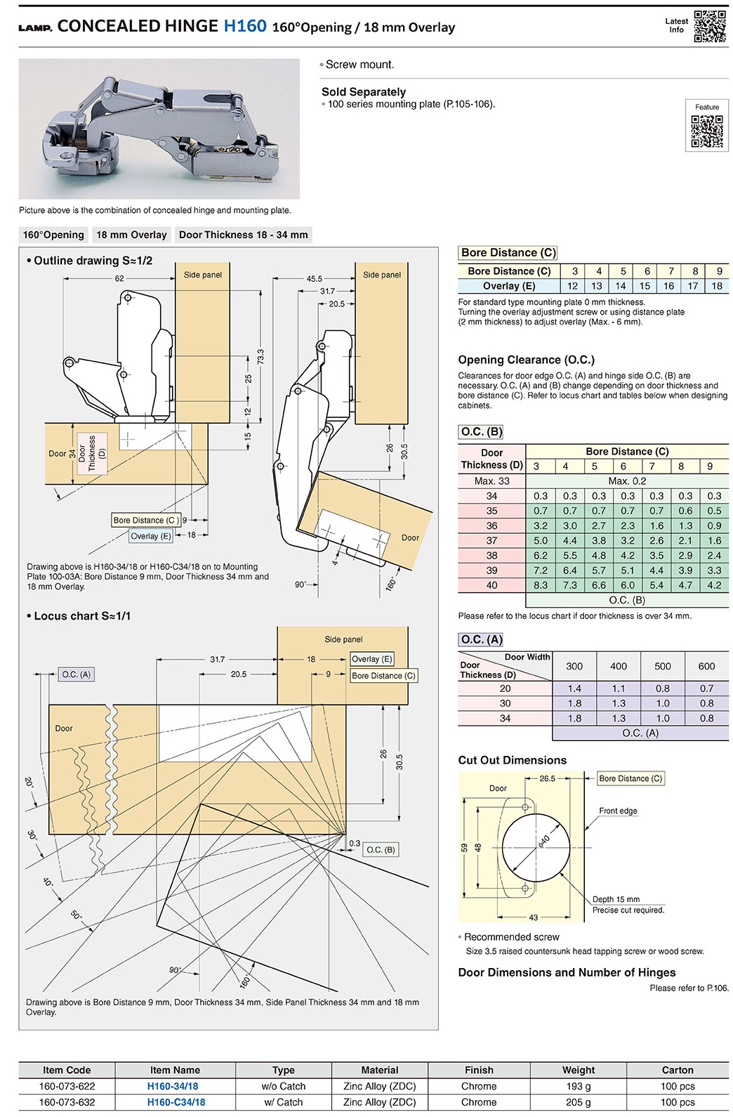 H160-C34/18 Петля для толстых фасадов с пружиной, наложение 18 мм, угол открывания 160°