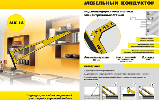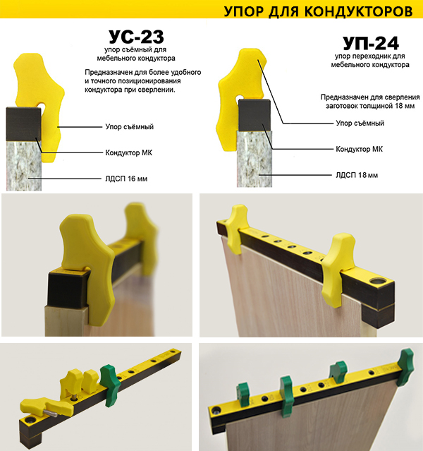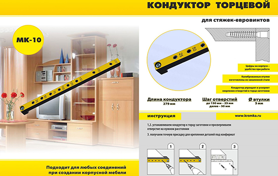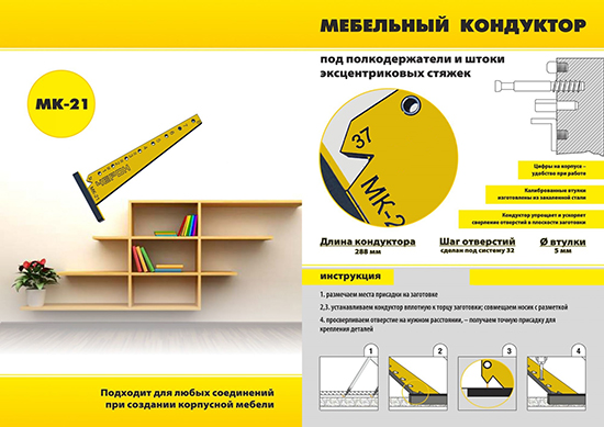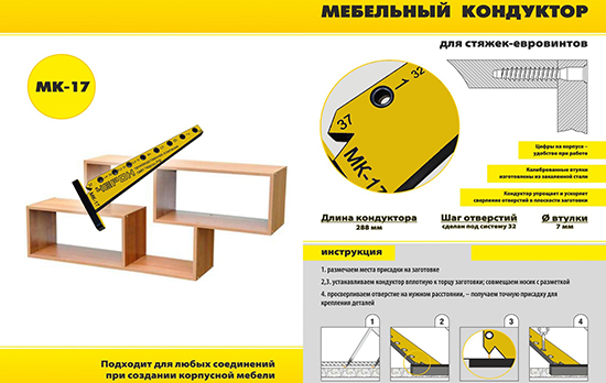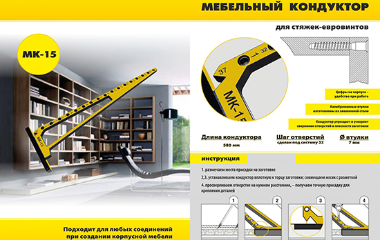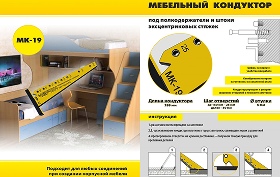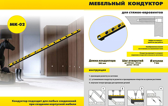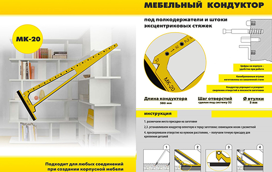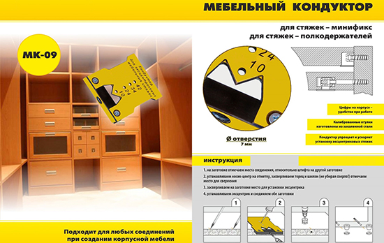 Мебельный кондуктор для эксцентиковых стяжек (минификс) , стяжек-полкодержателей. D отверстий: 7 мм и 4мм