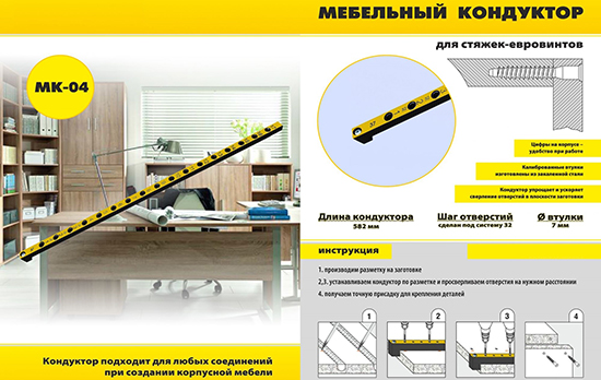 | Мебельный кондуктор укороченный для плоскости под стяжки-евровинты, система "32". Длина: 296 мм. Шаг отверстий: 1ое - 37мм далее - 32 мм. D отверстий: 7 мм
