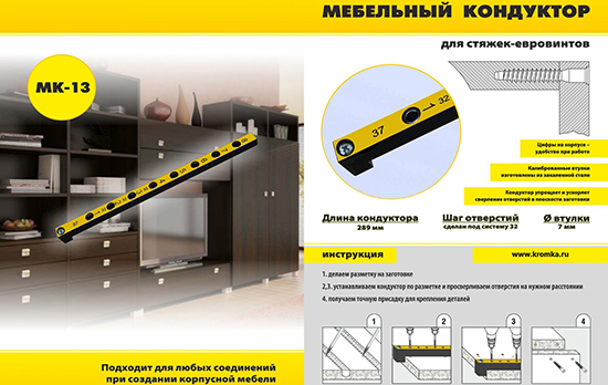 | Мебельный кондуктор "угольник малый " для плоскости под стяжки-евровинты, система "32". Длина: 288 мм. Шаг отверстий: 1ое - 37мм далее - 32 мм. D отверстий: 7 мм