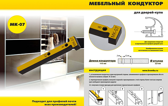Мебельный кондуктор для сверления отверстий в алюминиевых ручках дверей-купе. Длина: 140 мм. D отверстий: 6 мм