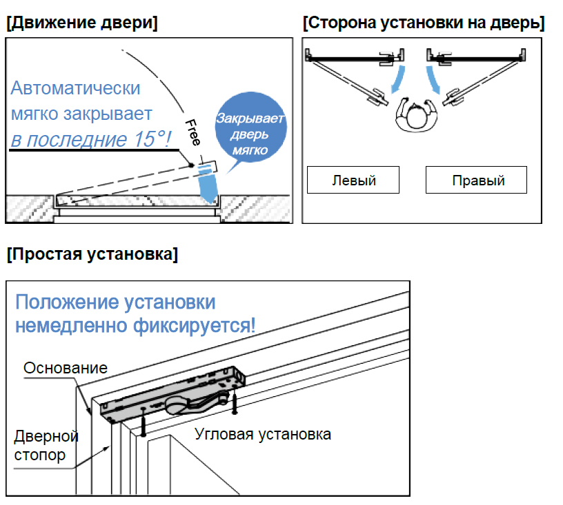 ● Дверь начинает медленно закрываться с более ранней позиции по сравнению с обычными дверными доводчиками, что снижает нагрузку на петли